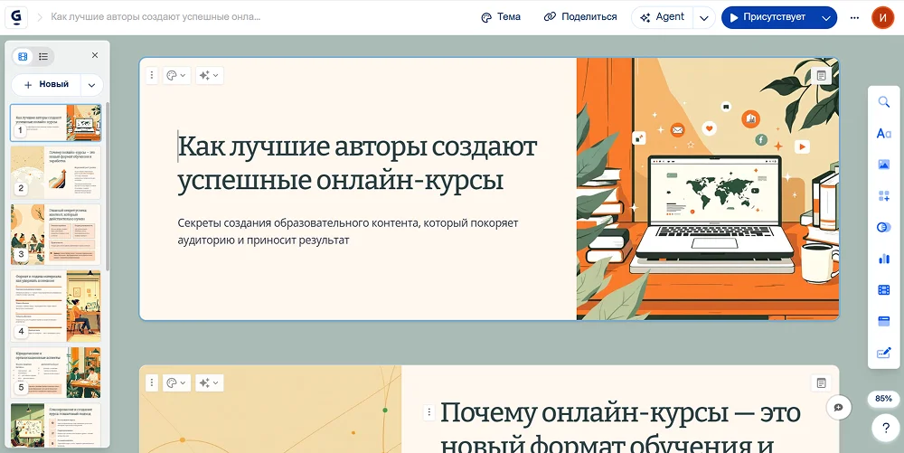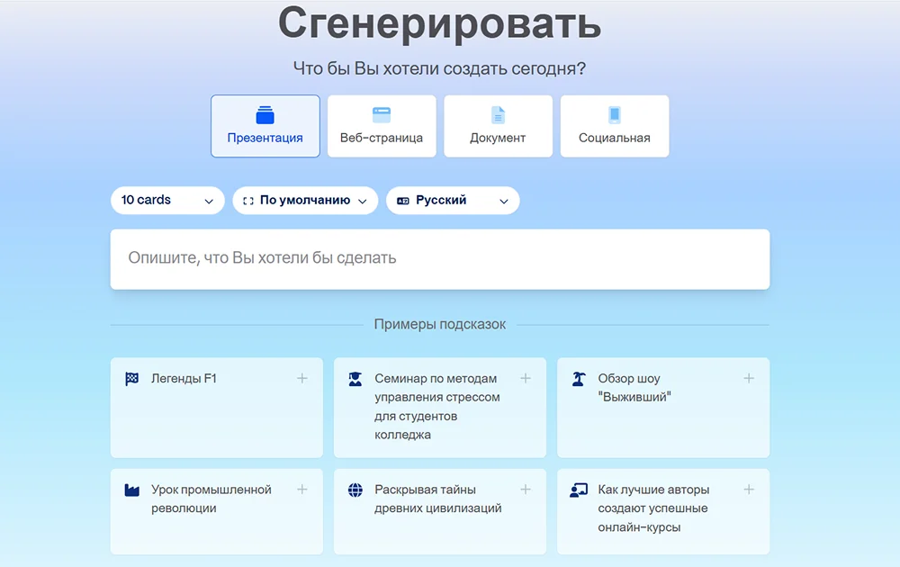 Сервис самостоятельно создает структуру, наполняет слайды информацией и подбирает визуальный контент, включая изображения и иконки. Пользователю не требуются навыки дизайна, чтобы быстро получить профессиональный результат.