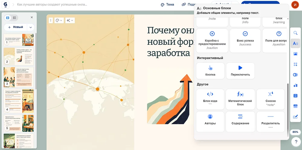 Сгенерированный материал получится отредактировать. Добавляйте или удаляйте страницы, меняйте их местами, регулируйте размеры и положение на листе каждого элемента. Скорректировать в Gamma у презентации бесплатно вы можете и оформление макета. Выбирайте стиль в библиотеке 100+ современных шаблонов, доступных для свободного использования. Все шаблоны сгруппированы по разным тематикам.